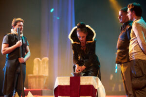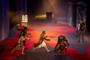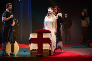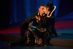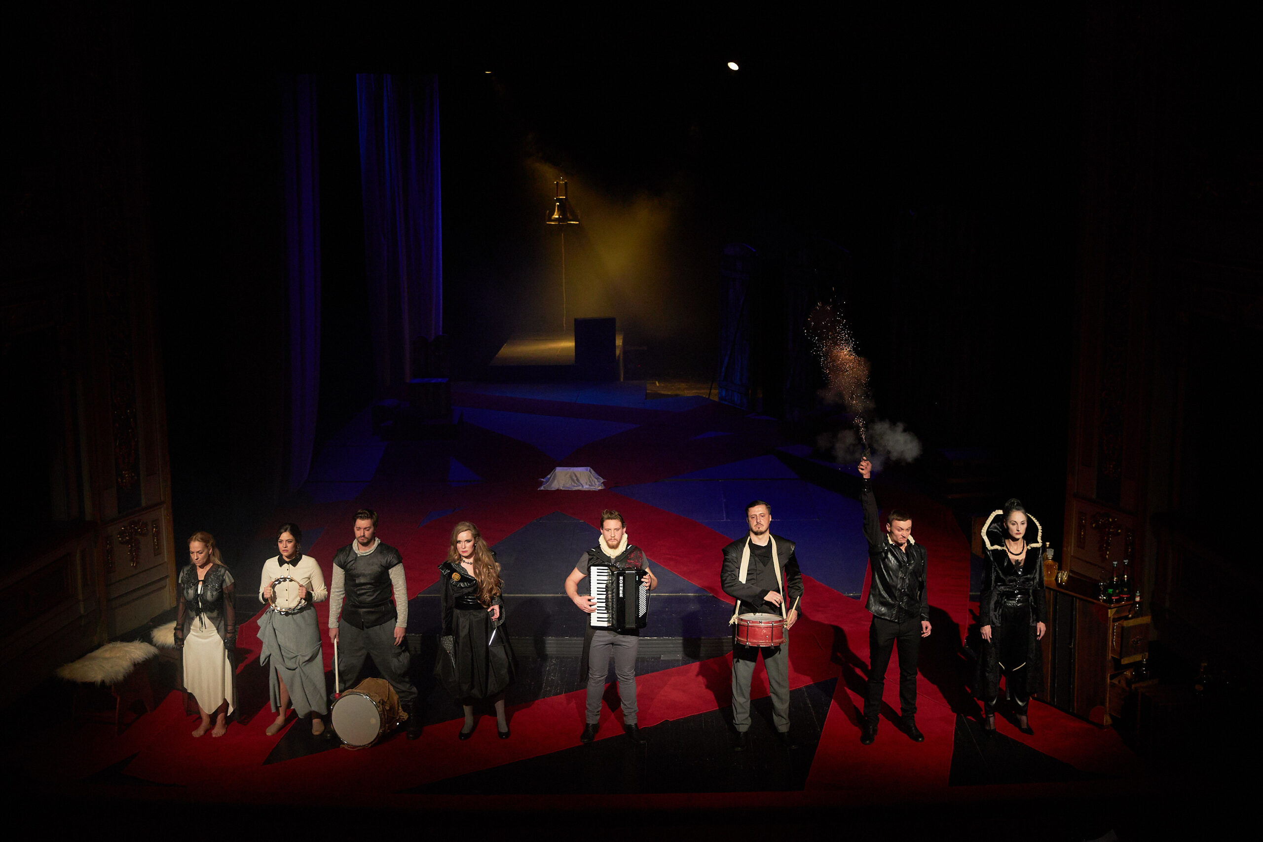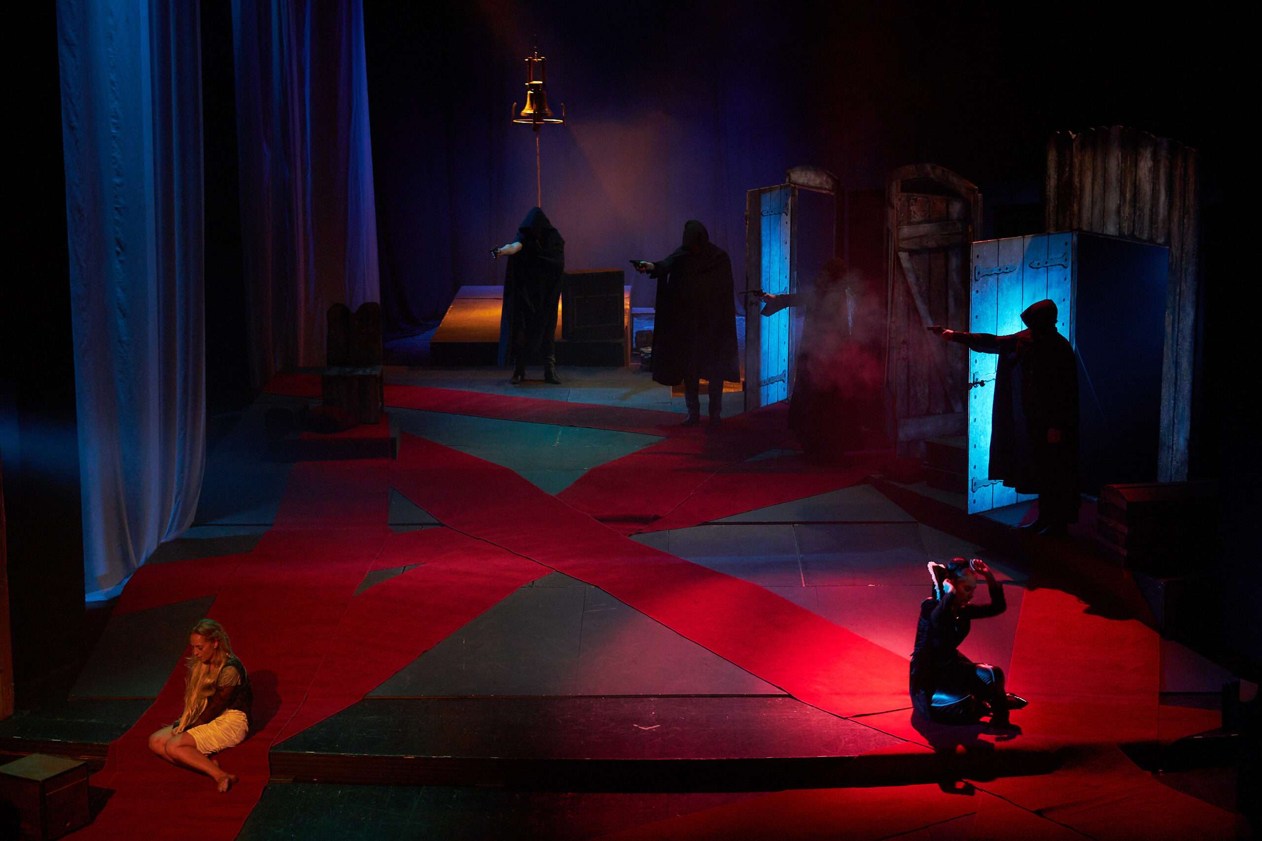 This adaptation of Schiller’s original drama retained the central plot lines and seven key characters, enriching them with new textual segments that, in a Brechtian mode, recount the broader historical and political context of the narrative. Alongside political tensions, the play places strong emphasis on the private antagonism between Queen Elizabeth I and Mary, Queen of Scots — particularly on their shared romantic focus on the same man — a dynamic that further inflames their conflict and humanises both rulers.