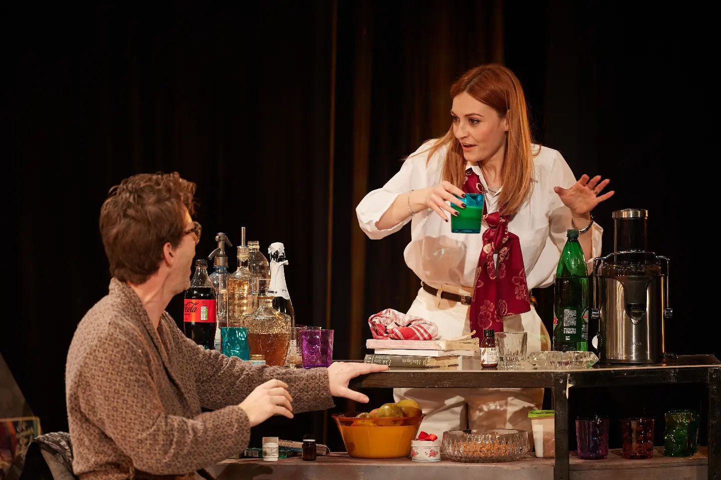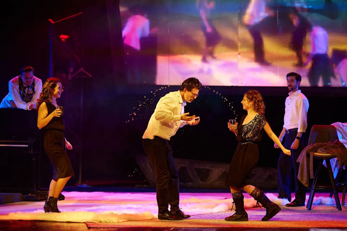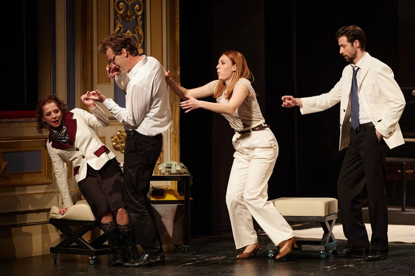The central challenge in staging Allen’s contemporary classic, with its strong psychological drive, was to avoid a “talking heads” realism and instead amplify the dynamic, neurotic states in which the boundary between fiction and fact begins to dissolve. In this way, not only is the comedic rhythm sharpened — allowing the witty dialogue of this humorous drama to fully resonate onstage — but the fast-paced performance style also creates a chaotic yet structured portrait of the world as experienced by the protagonist.