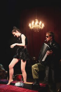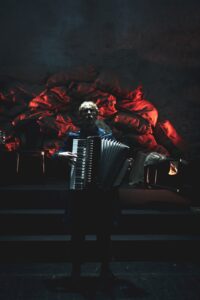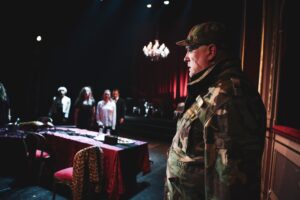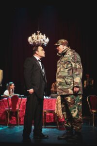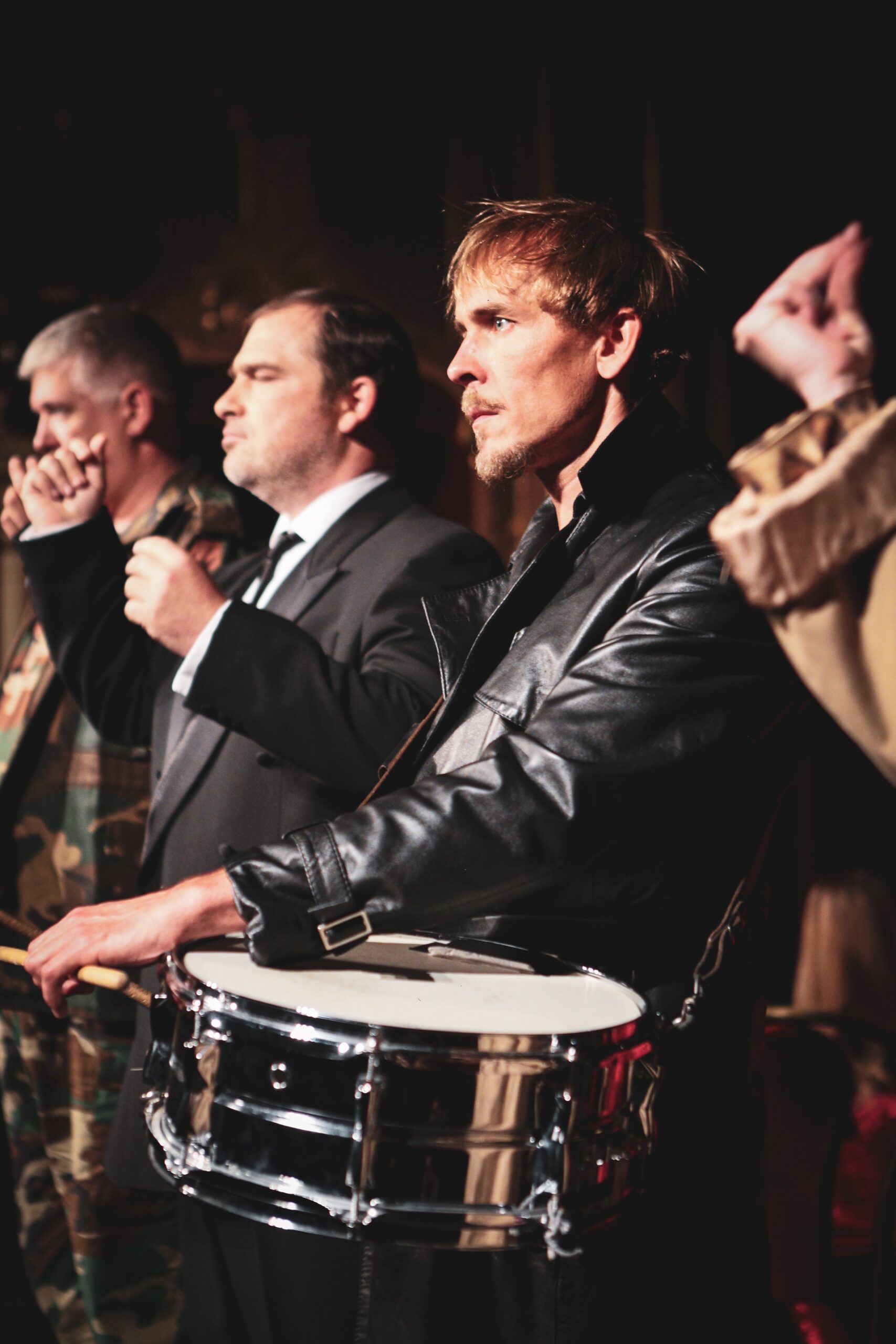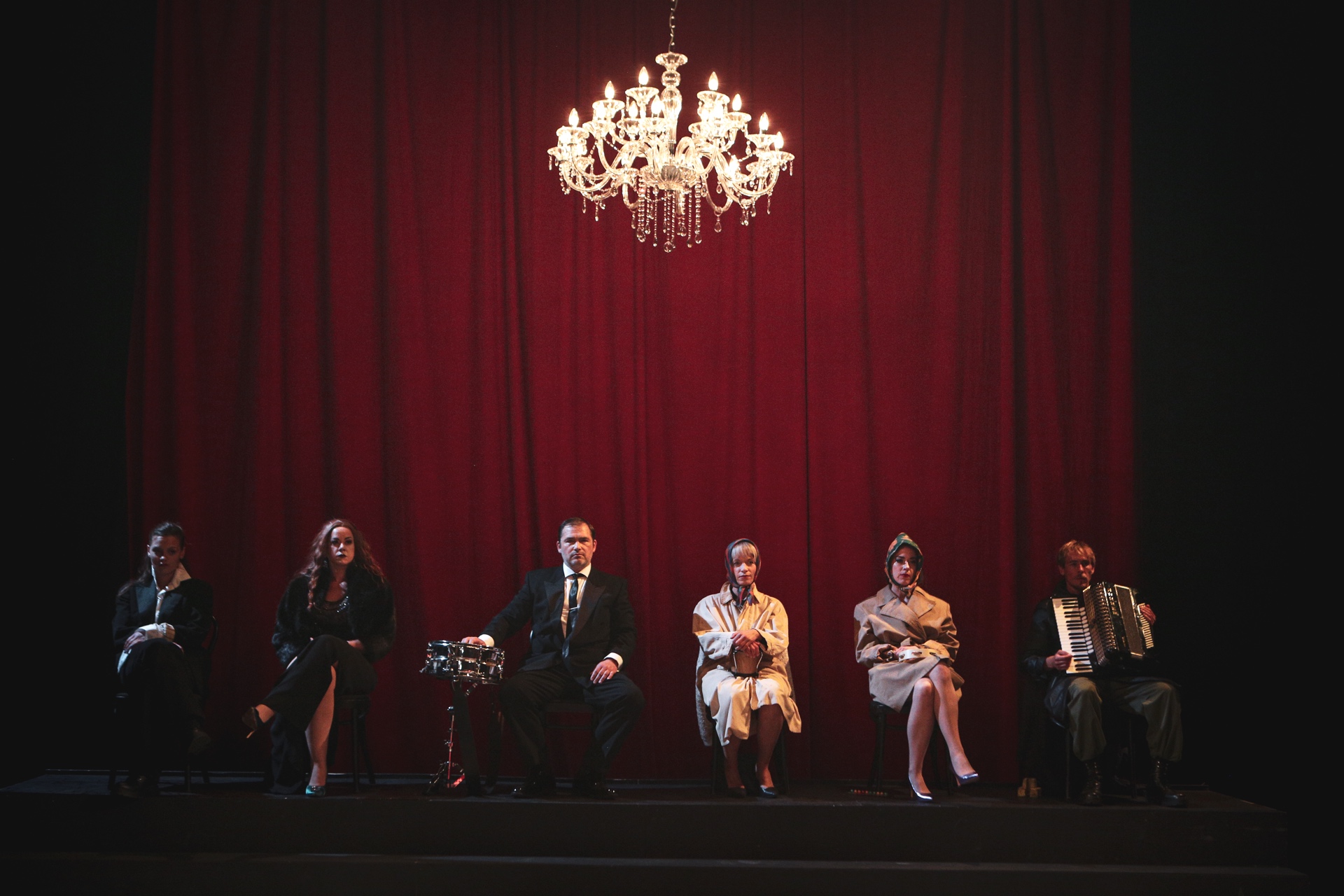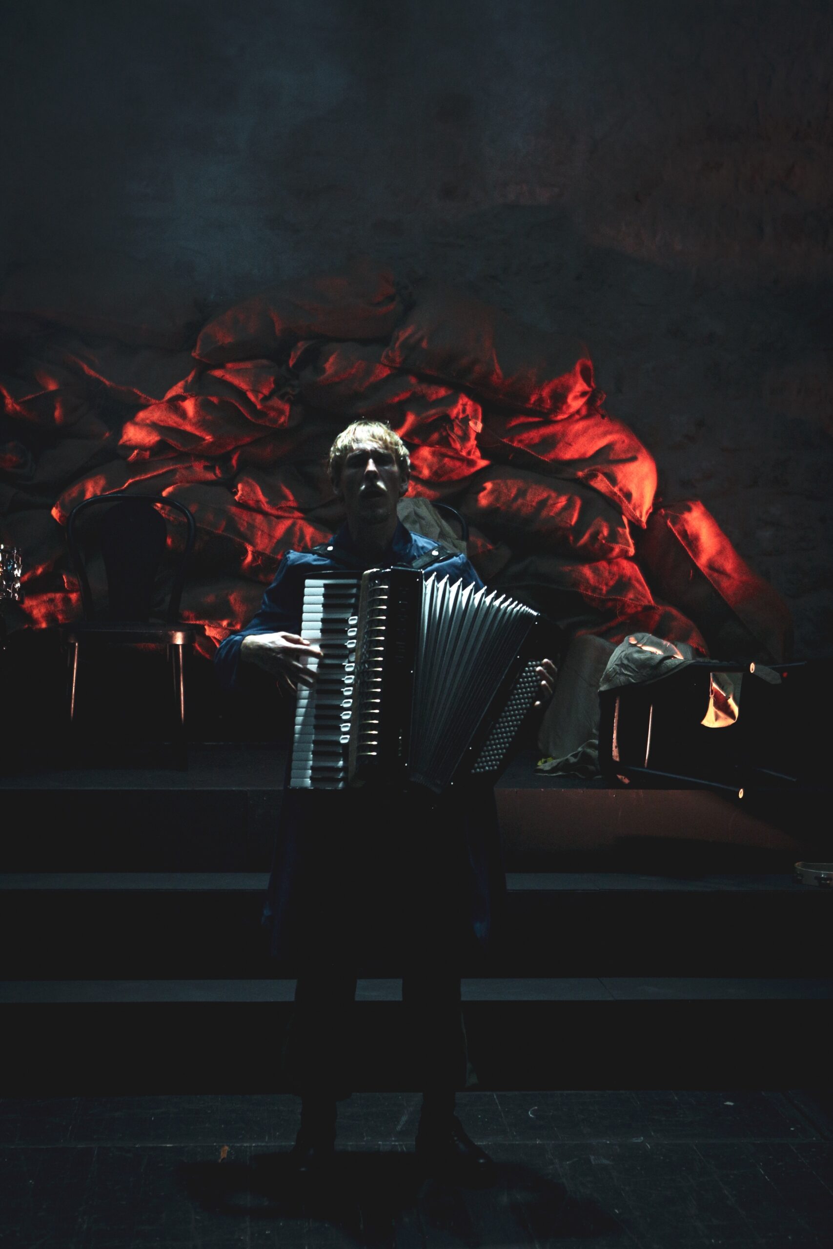 The protagonist — a war hero at the beginning and a victim of his own people by the end — is haunted by the demons left in the wake of war. The adaptation was a rewriting of the original text, approached with a strong awareness of the present moment, shaping the hero as a moral compass in a decadent world of political opportunists. His demons emerge through Brechtian songs that stand in contrast to the dramatic scenes portraying the brutality of the real world and human nature. The production is marked by a powerful, atmospheric intensity.
